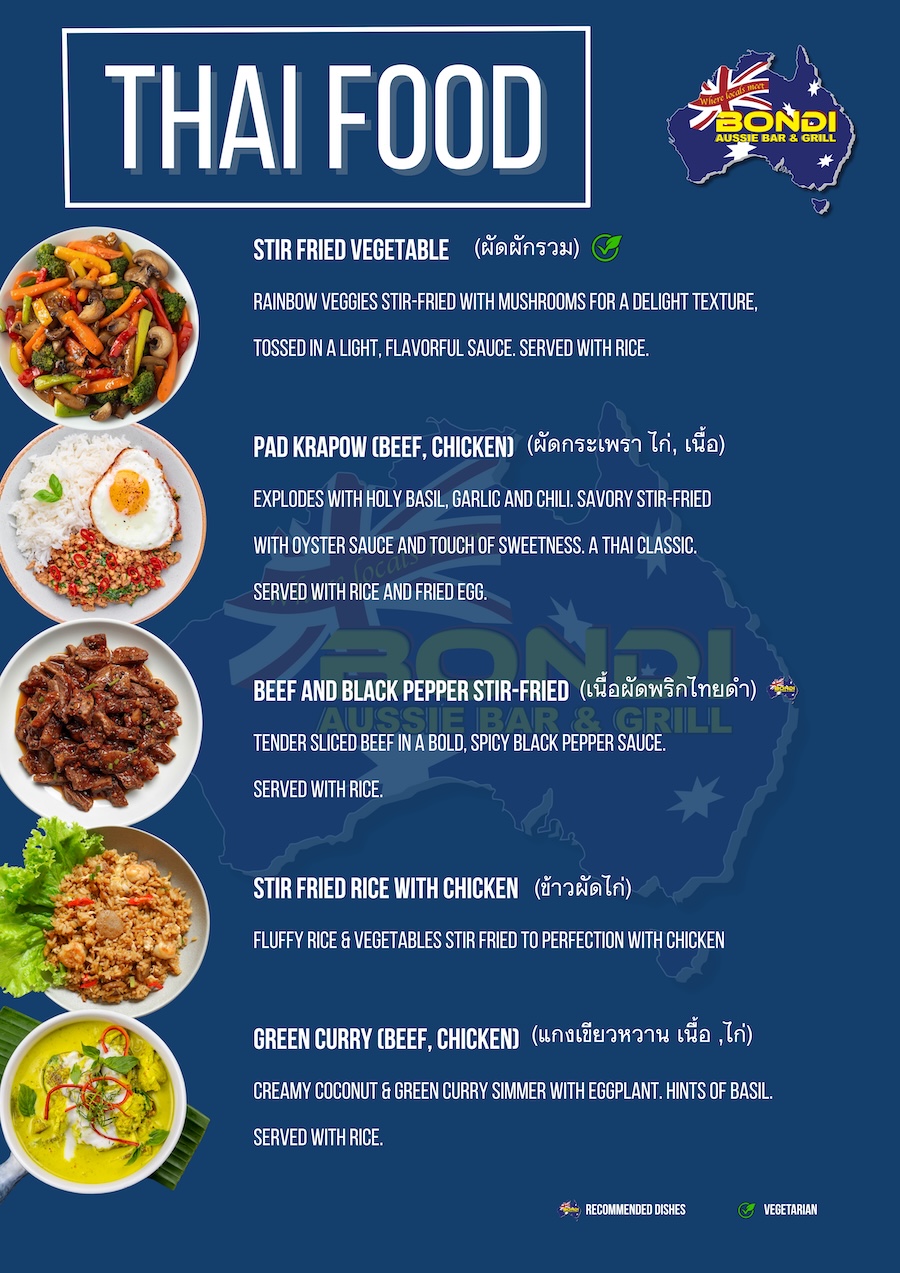 Bondi Aussie Bar & Grill is an Australian themed family-friendly venue, located conveniently at the beginning of Soi Green Mango in Chaweng. We serve award-winning food accompanied by an extensive drinks menu, and not just that, Bondi Aussie Bar & Grill also broadcasts LIVE sports including AFL, NRL, Premier League, daily live music performances and more – everything you’d expect of an Aussie bar on Samui.